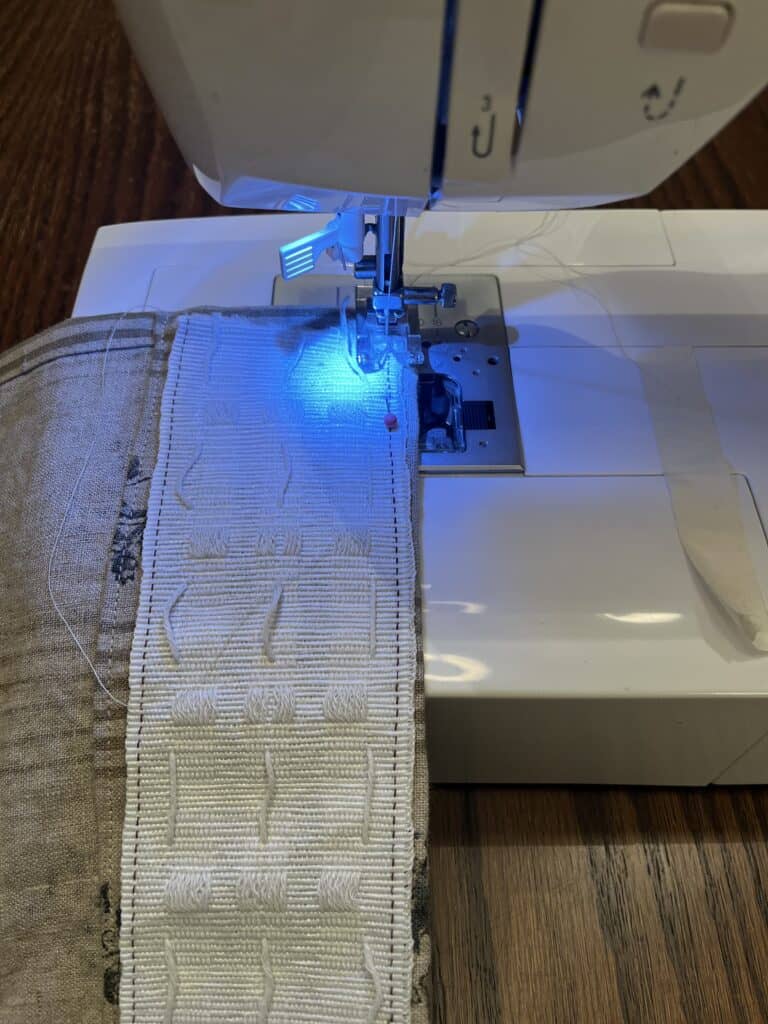 Next, measure and cut the pleat tape to fit the total width of your fabric. Pin in place and, following the stitch guides on either side, sew in place. Do not sew the sides of the pleat tape! We will use them in a later step.